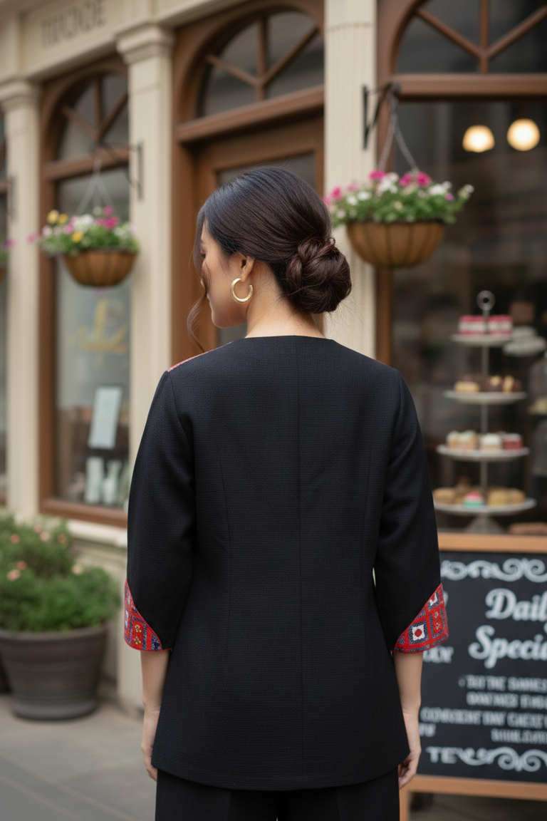 Chest Circumference: 44" | Total Length: 30" (shoulder to hem) | Sleeve Length: 18" (shoulder to wrist) | Wrist Width: 5.5" | Material: Handmade patterns on non-stretch textile | Features: Side pockets and front button