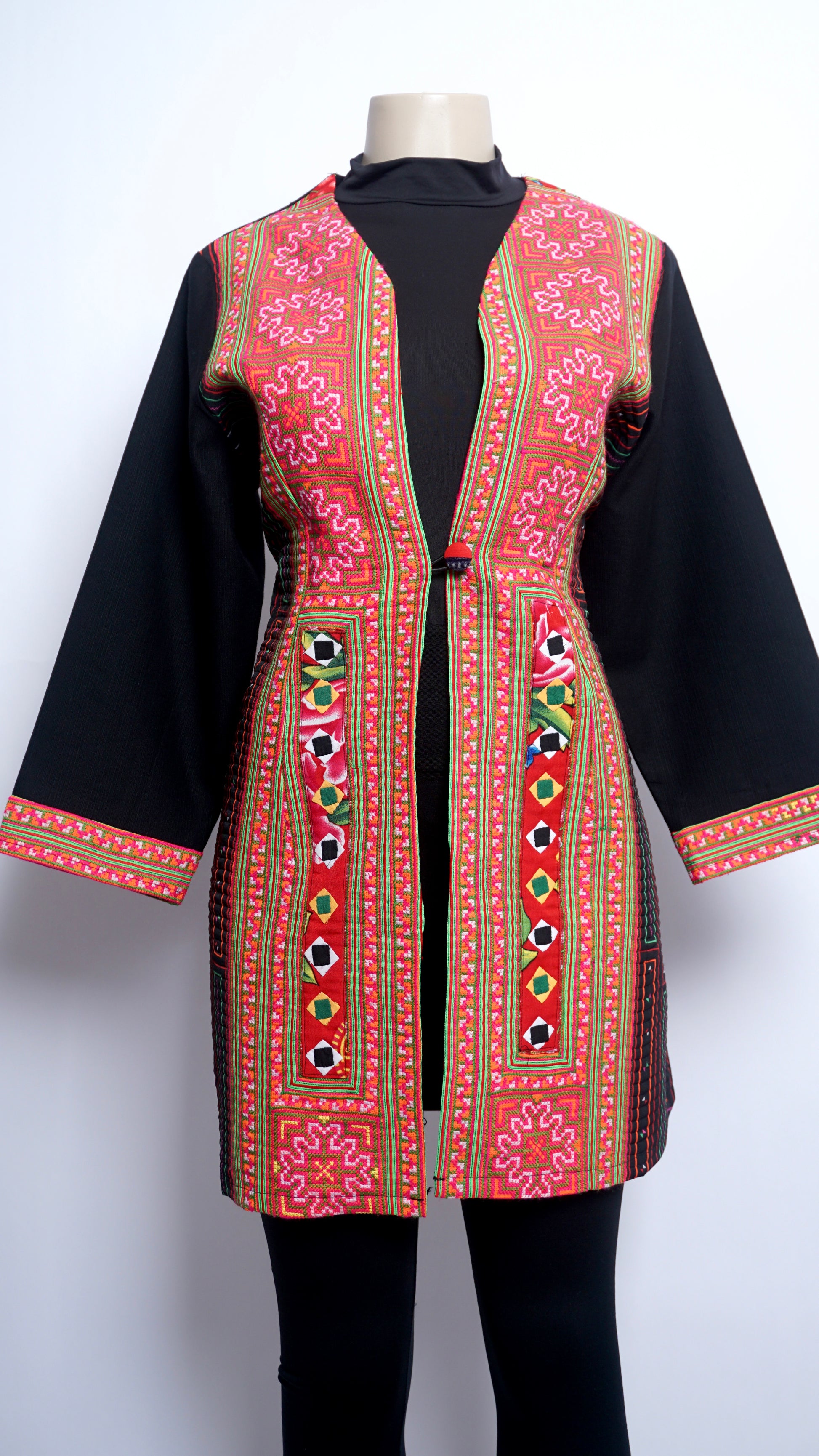 Chest Circumference: 44" | Total Length: 34" (shoulder to hem) | Sleeve Length: 20" (shoulder to wrist) | Wrist Width: 6.5" | Material: Handmade patterns on non-stretch textile | Features: Side pockets and front button