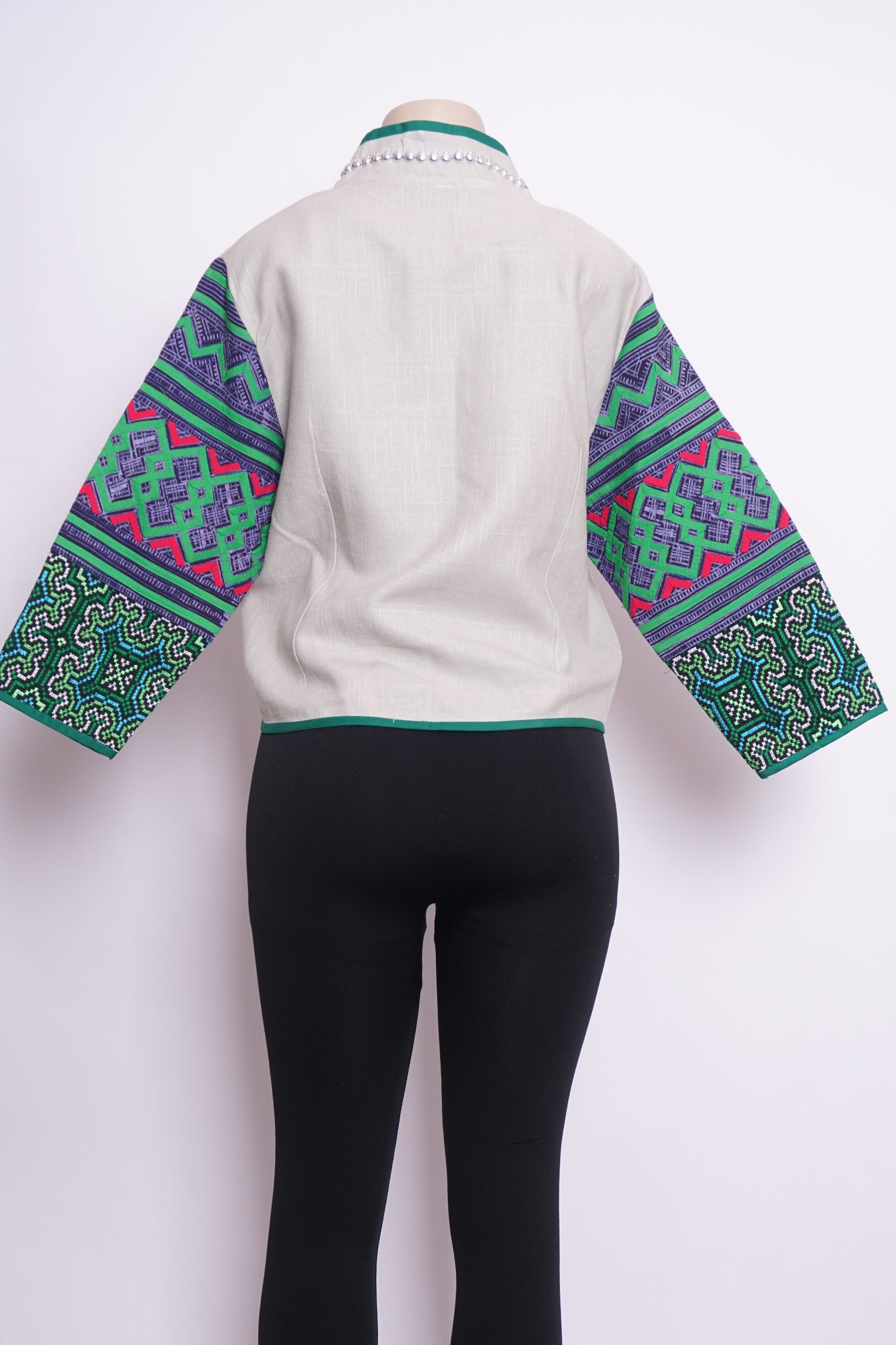 Chest Circumference: 44" | Total Length: 21" (shoulder to hem) | Sleeve Length: 18" (shoulder to wrist) | Wrist Width: 5.5" | Material: Handmade patterns on non-stretch shinmai Thai cotton textile | Features: polyester tassel