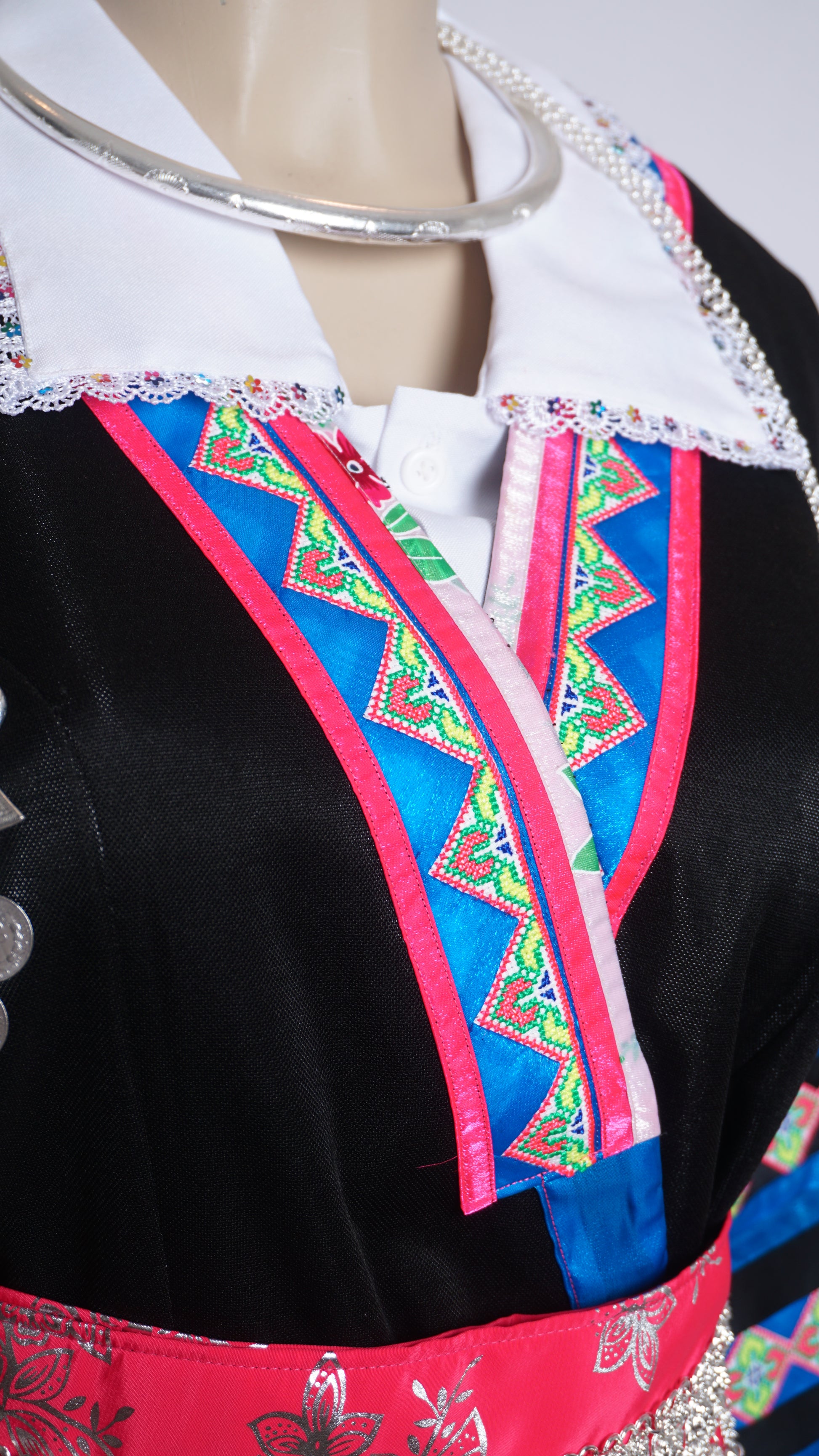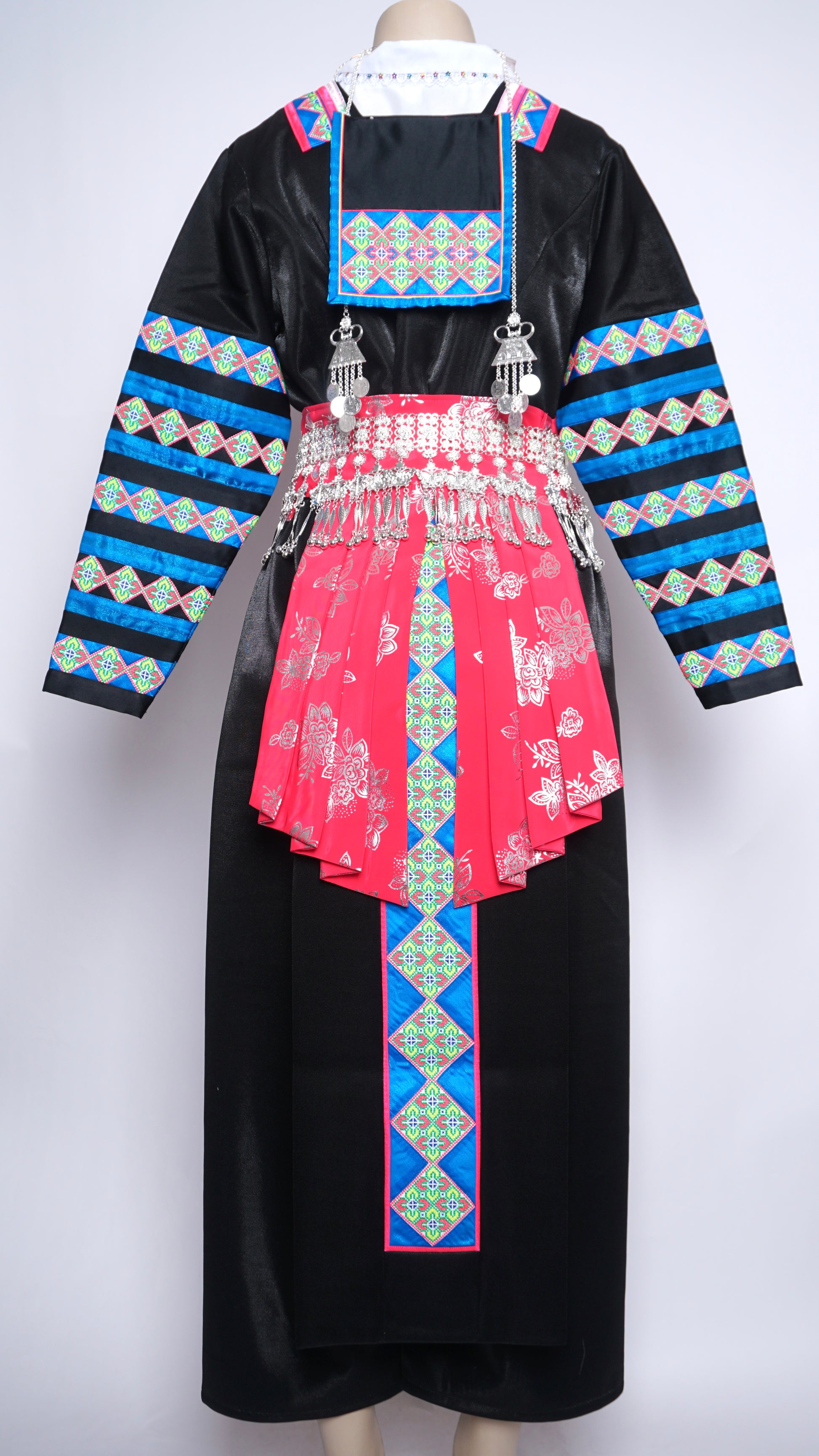 Product Includes: Shirt, 2 Sev, Pants, | Chest Circumference: 42" | Shirt Length: 24" (shoulder to hem) | Sleeve Length: 22" (shoulder to wrist) | Wrist Width: 4" | Sev Length & Width: 34" long, 10" wide | Material: Handmade pajntaub tawm laug on ntaub 10k black fabric, slight stretch fabric