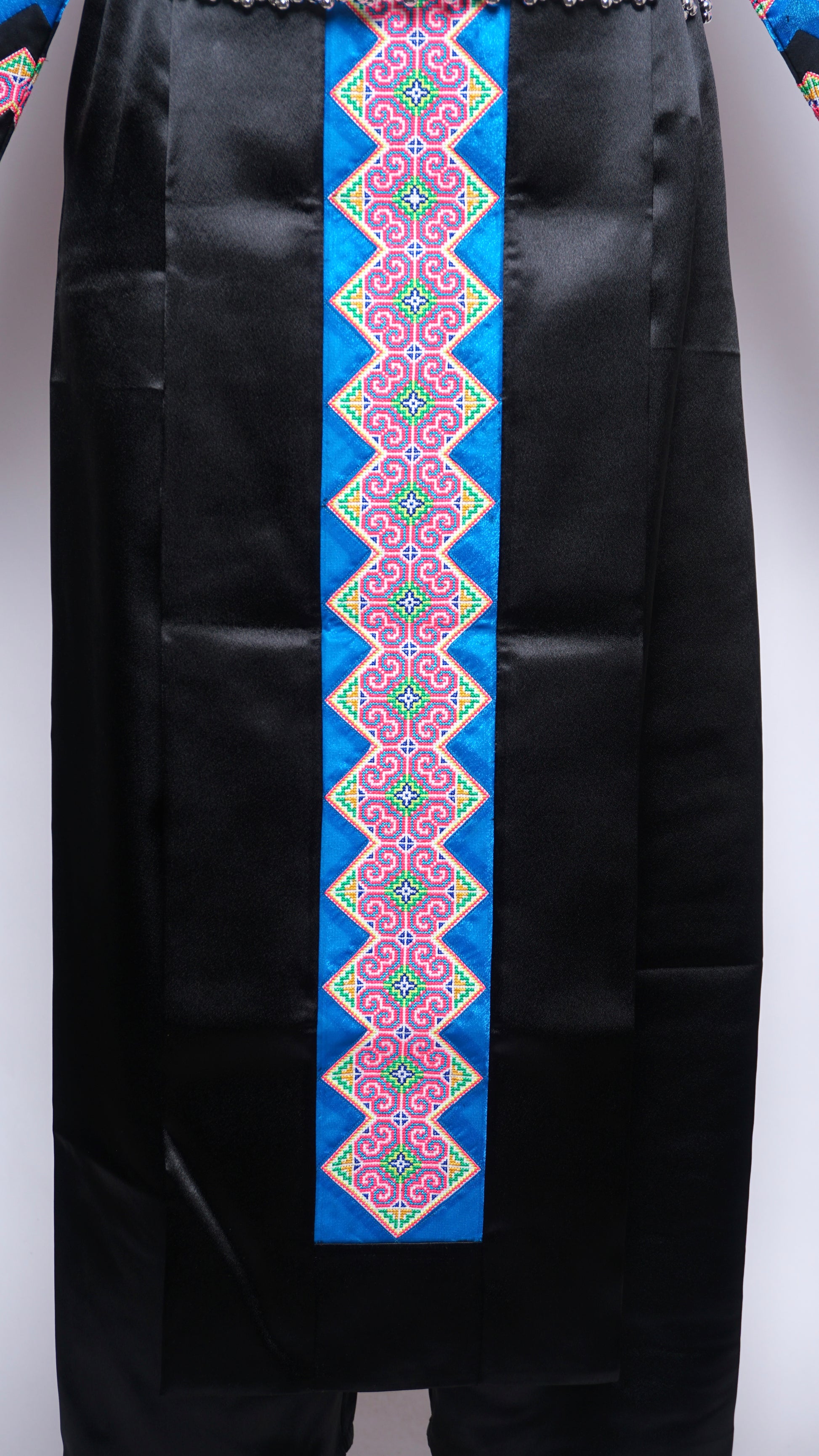 Product Includes: Shirt, 2 Sev, Pants, | Chest Circumference: 44" | Shirt Length: 23" (shoulder to hem) | Sleeve Length: 22" (shoulder to wrist) | Wrist Width: 4" | Sev Length & Width: 35" long, 10" wide | Material: Handmade pajntaub tawm laug on silk fabric, non-stretchy fabric